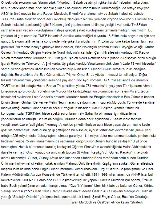 - O dönem ki RTÜK yasası gereği Türkiye’de bir ulusal kanalın en fazla %25’i yabancılarınn olabilmektedir ve bu şirket tahmin edeceğiniz gibi Ruperth Murdoch’un SABAH-ATV ihalesine katılıp grubu almak için kurdurduğu şirkettir…
