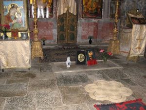 - Ortodoks adetlerinde görülmemiş bir şekilde manastırın girişinin hemen sağında daha önce denk gelinmemiş bir mezar taşı bulunur.