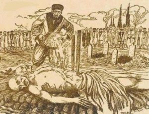 • Ardından kalplerini çıkarıp kaynar suda haşlıyor. Artık mezarı geri örttüler de yine garip olaylar mı oldu yoksa cesetlerde bir şey mi gördüler bilinmez, yeterli bulmayarak cesetleri ateşe veriyorlar.