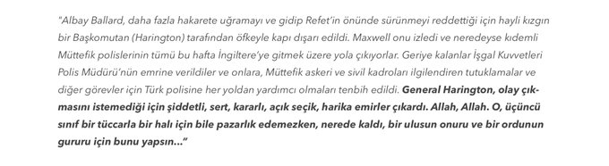 - General Harrington, zaten yumuşak başlı, Türklerle iyi geçinmek isteyen bir idarecidir. Mustafa Kemal’e hayrandır. İstanbul’u, İstanbulluları seven biridir. Hatta daha dün işbirliği yaptığı isimlerin tutuklanmalarına yardımcı bile olmaktadır.
