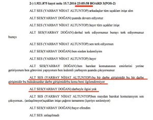 - Başlangıçta faaliyetlerin TMH olduğunu düşünen Altıntop 23:05 sıralarında olayın darbe girişimi olduğunu anlıyor. Tartışma yaşıyor.