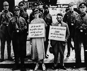 - Ve bu yasaların sonuçları olarak, bir otel odasında basılan Hristiyan kadınla Yahudi adamın ifşa edilmesi… Kadın: “Ben buralardaki en büyük domuzum ve yalnızca Yahudilerle birlikte oluyorum.” Erkek: “Yahudi genci olarak her zaman ve yalnızca Alman kızlarını odama alırım.”