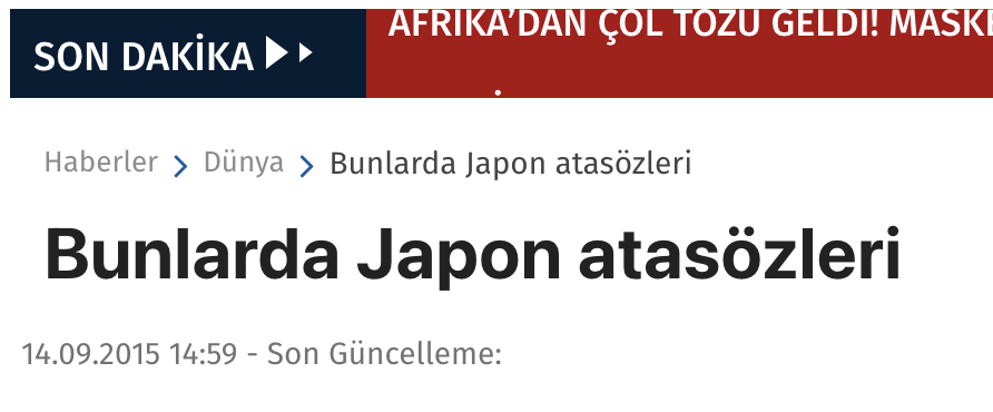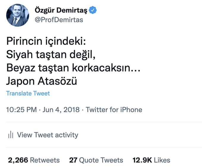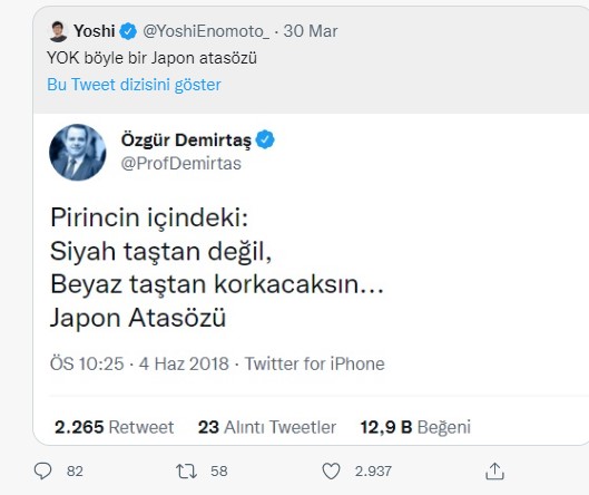 • 4 yıl sonra Japon arkadaşımız bunun Japon Atasözü olmadığını yazmış. Doğrudur, ben Japonya’da yaşamadım. Twitin altı da Özgür Demirtaş trolleri ve ooo Fırsat doğdu diyenlerle dolmuş. Sanmışlar ki ben bunun bir Japon Atasözü olduğunu uydurmuşum :)Halbuki