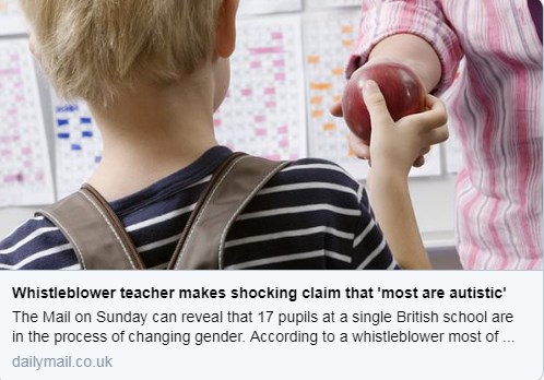 - İngiltere’de bir okulda zihinsel engelli 17 öğrenci cinsiyet değiştirdi. Sayının yüksekliği dikkat çekti. Konunun araştırılmasıyla okulda görev yapan bir öğretmenin otistik çocuklara “yanlış cinsiyettesin” telkini uyguladığı ortaya çıktı!