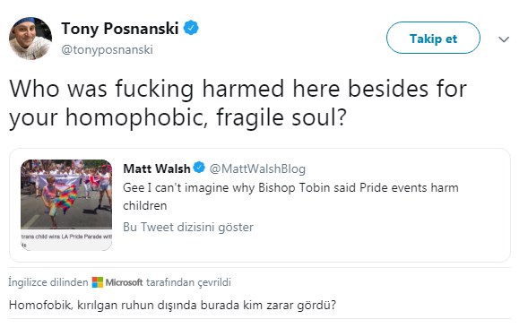 - Los Angles Onur Haftası yürüyüşüne 7 yaşındaki bir trans çocuk öncülük etti. İngiliz komedyen Tony Posnanski bu fotoğrafı eleştirenleri hedef alarak “burada kim zarar görüyor” diye paylaştı… Çocuk Tony! Çocuk zarar görüyor!
