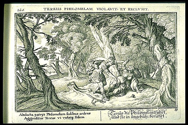 - En nihayetinde Prokne’nin kızkardeşi Philomela’yı gözüne kestirdi. Philomela da evliydi ama Tereus için bu bir sorun teşkil etmiyordu. Philomela onu sertçe reddedince ona karşı arzusu iyice kamçılandı. Uygun zamanı kolladı ve baldızını yalnız yakaladı ve ona tecavüz etti.