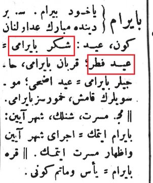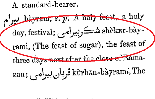 - Redhouse’dan bu alıntıları yaptığım Lexicon 1890’da basılmıştır ama kendisinin 1861de basılmış Kitâb-ı Lehçetü’l Maâni adlı daha dar kapsamlı bir başka sözlüğü de vardır.Şeker Bayramı ifadesini o sözlükten de kontrol ettim.Bayram maddesi altında Şeker Bayramı: The feast of sugar.