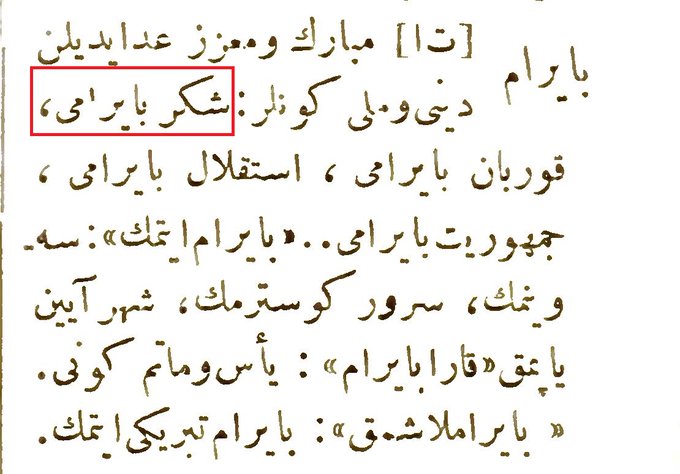 - “Şeker Bayramı” kullanımı eski yazı başka lügatlerde de var. Bu platformda akademik bir platform olmadığı için detaylara girmeden 2 başka sözlükten ilgili kullanımlara ait 2 görüntüyü daha paylaşmak istiyorum, eski yazı okuyanlar açıklamalara bakabilirler.