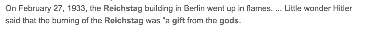 • Böylece Hitler bir hamlede yalnız siyasî düşmanlarını resmen susturmakla ve onları istediği zaman tutuklama hakkını elde etmekle kalmıyor, aynı zamanda, Komünist tehlikesini de “resmen” ayyuka çıkarmakla milyonları bulan orta sınıf halkta ve köylüde, bir hafta sonra yapılacak Yeni seçimlerde Nasyonal Sosyalizme, yani Hitler’e oy vermedikleri takdirde…