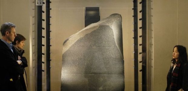 - Gelelim bu hiyerogliflerin nasıl deşifre edildiğine. Aslında her şey 200 öncesine dayanıyor. Dili, bilimi, sanatı ya da tarihi olsun, antik Mısır’ın üzerine yapılan bütün çalışmalar işte bu resimde gördüğünüz taş sayesinde başlamıştır: “Rosetta Taşı”.