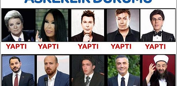 • Bizim zamanımızda askere gitmeyenleri adam yerine koymazlardı, toplumdan dışlarlardı diyen cumhurbaşkanının çocukları ve damatlarının askere gitmeyip çürük aldıklarını ya da bedelli askerlik yaptıklarını biliyor muydunuz?