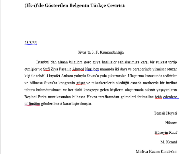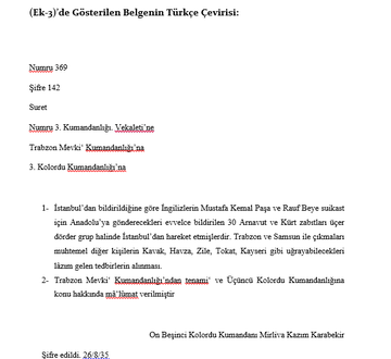 • Kazım Karabekir Paşa, Trabzon Mevki Kumandanlığı ve 3. Kolordu Kumandanlığına gönderdiği şifre de İngilizlerce görevlendirilen kişilerin Trabzon ve Samsun’dan giriş yapmasının muhtemel olduğunu ve bu kişilerin uğrayabilecekleri yerlerde gerekli tedbirlerin alınmasını istedi.