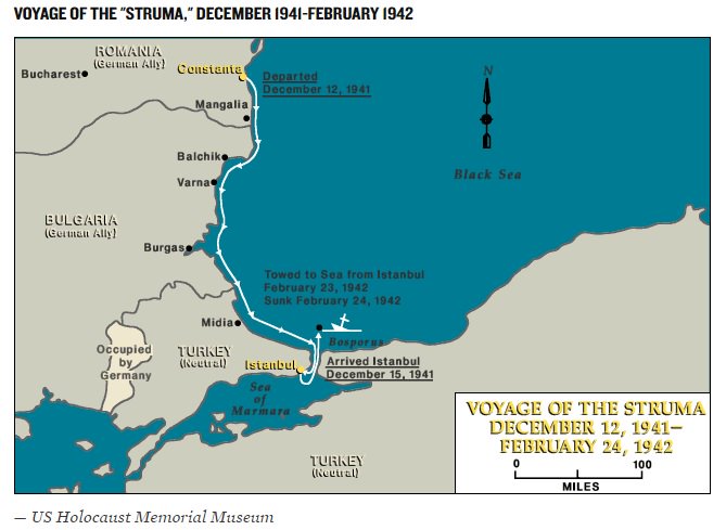 - Struma, 15 Aralık 1941’de Sarayburnu açıklarına demirler. İngiltere ve Almanya’nın baskılarına boyun eğen Türk hükümeti, limana girme ve yolcu indirmesine izni vermez. İspanya’dan kalyonlarla Yahudileri kurtaranların torunları, şimdi iltica başvurularını kabul etmemektedir.