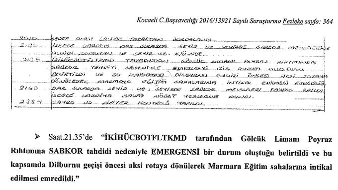 - 15 Temmuz akşamı saat 21.40 sularında köprüüstünden telefon gelmiş, Gölcük’te terör saldırısı ihbarı yapıldığı için Gölcük’e gitmek yerine Komodor Levent Kerim Uça’nın emriyle Marmara’ya geri döndüğümüzü öğrenmiştim. Bunun üzerine köprüüstüne (gemiye kumanda edilen yer) çıktım.