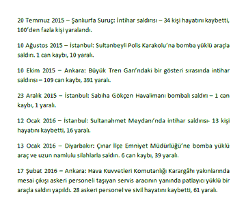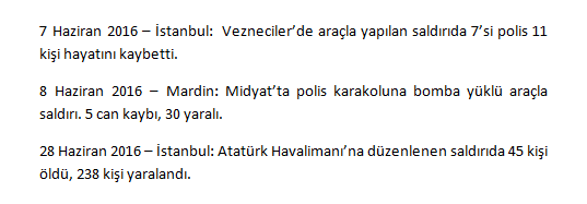 - Ayrıca 15 Temmuz 2016’dan önceki yaklaşık son bir yıl içerisinde tam 15 tane büyük terör saldırısı gerçekleşti. Bu saldırılarla toplam 331 vatandaşımız can verdi, 1300 civarında vatandaşımız da yaralandı.