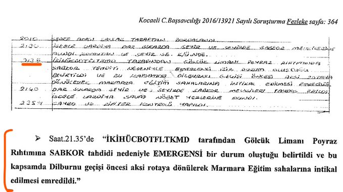 - 15 Temmuz akşamı saat 21.40 sularında köprüüstünden telefon gelmiş, Gölcük’te terör saldırısı ihbarı yapıldığı için Gölcük’e gitmek yerine Komodor Levent Kerim Uça’nın emriyle Marmara’ya geri döndüğümüzü öğrenmiştim. Bunun üzerine köprüüstüne (gemiye kumanda edilen yer) çıktım.