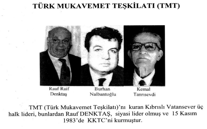 - 1957 yılında Lefkoşa’da yapılan toplantıda bulunan üç isim TMT’nin kurucuları olarak geçer. Bu üç isim toplantı sonrası vakit kaybetmeden örgütlenme işine girişmiş ve 3 ay gibi kısa bir sürede Türklerin yaşadığı çoğu yerde örgütlenmişlerdir.