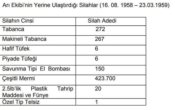 - Arı Ekibi’nin Yerine Ulaştırdığı Silahlar (16. 08. 1958 – 23.03.1959)