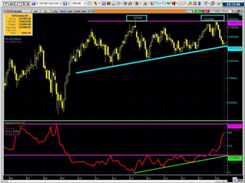 • 2013 deki 93000 zirvesi sonrası Ocak 2018 de 121000 ler test edilirken dikkat çekmemiz gereken bir durum var. Bu 5 yıllık süreçte 2013 de 93000 endekste 200000 test eden banka endeksi, 2018 de 121000 endekste 194000 e gelebildi. Yeni zirve yapamadı.Bunun en etkili sebebi faizdir.