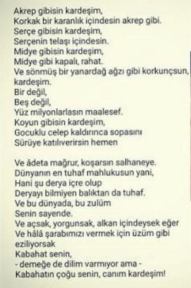 • Bunu diyenleri “biz hep böyleyiz” diyenleri hapislerde çürüttünüz siz, sınıra ulaşmak isterken kafasına vurarak öldürdünüz. vatan haini dediniz size gerçekleri söyleyenlere. şimdi kalkmış ne zaman böyle olduk.. buyrun 18 sene verdiniz bu şiire. halkı dediniz askerlikten soğutuyor.