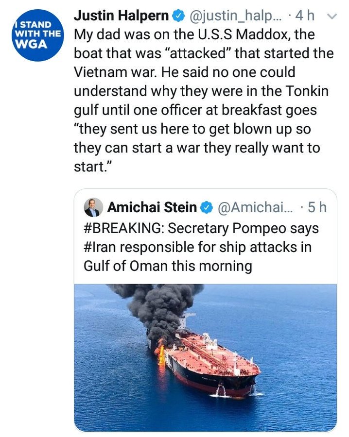 ABD, savaş istediğinde halkına meşru müdafaa gibi göstermeyi sever. 1ci savaşa girişi batırılan yolcu gemisi, 2ci savaşa girişi Pearl Harbour, Vietnam savaşı ise Tonkin müsameresiyle oldu. Irak’a ilk saldırması Kuveyt’in işgali, 2ci saldırı ise 11 Eylül bahanesiyle gerçekleşti.