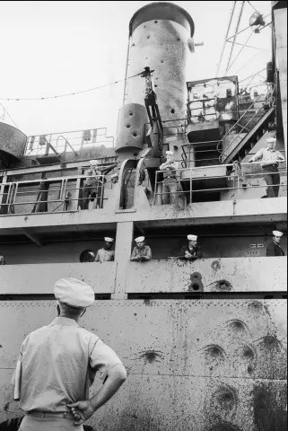 • Bu ilk saldırıdan sonra anten, radar… iletişim ve dinleme için kullanılan ne varsa tahrip olmuştu ama geminin gövdesi ve makine dairesi sağlamdı. Bomardıman sırasında Amerikan bayrağı yanmıştı. Kaptan yeni ve daha büyük bir bayrak çektirdi.