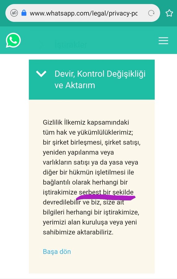 - İlginç bir şekilde başka birçok kişi de “WhatsApp’ta uçtan uca şifreleme sistemi var, kesinlikle kişisel verileri kullanmıyor” diye itiraz etmiş. Bu, WhatsApp’ın başkanının söylediği ve Gizlilik ve Güvenlik kısmında mecburen yer alan bir yalandan ibaret.