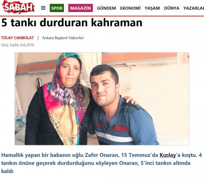 - Erdoğan’ın damadı Berat’ın abisi Serhat Albayrak’ın sahibi olduğu SABAH gazetesini 6.8.2016 tarihinde eline alan yurttaşlar Tülay Canbolat imzası ile çıkan “15 Temmuz’da beş tankı durduran” başlıklı haberi BÜYÜK BİR TAKTİRLE okudular.